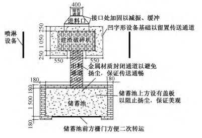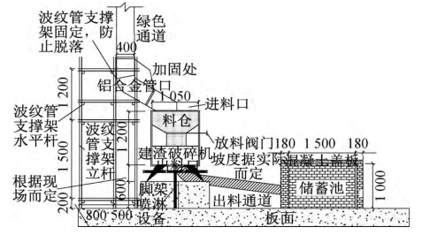 楼层竖向建筑垃圾绿色运输通道搭设完毕后,修建底层储蓄池及破碎机安装平台,现场根据运输通道落口位置搭设相应面积的加工棚,加工棚两侧地面布置喷淋设备,进行洒水,达到减尘效果。提前做好破碎机基础,其大小随选用的破碎机大小而定,每边均超出破碎机边缘 250mm 左右,中间部分有向下的凹口,用于出料,破碎机进场后放置于加工棚内的基础上,连通水、电设备后,即可投入使用。破碎机为市场采购的现有产品,可以根据实际情况选择合适的型号。