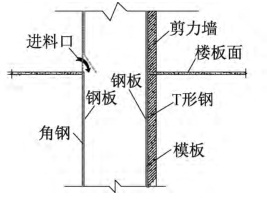 将主龙骨角钢及 T 形钢采用膨胀螺栓固定在剪力墙或砖墙上,同时安装剪力墙或砖墙一侧的运输通道封闭模板。