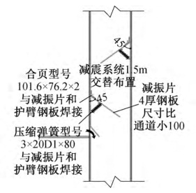 在建筑垃圾绿色运输通道左、右两侧通道内侧安装压缩弹簧及减振片。压缩弹簧的型号为 3 × 20D1 × 80,按照 GB /T2089—2009《普通圆柱螺旋压缩弹簧尺寸及参数(两端圈并紧磨平或制扁)》,减振片采用 4mm 厚钢板制作。压缩弹簧及减振片在建筑渣土下落过程中起缓冲作用,减振片每隔 1 500mm 交叉设置,采用合页焊接固定在运输通道内钢板上,如图 5 所示。