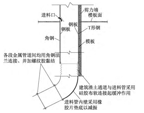 建筑垃圾绿色运输通道及回收系统包括运输通道、通过破碎机料管与运输通道连接的破碎机、通过出料通道与破碎机连接的储蓄池以及位于破碎机两侧的喷淋设备,建筑垃圾绿色运输通道沿建筑的竖直方向设置。运输通道在每层楼均开有进料口,竖直固定在室内烟道预留口处,通过角钢、T形钢及螺栓与室内烟道预留口周围的剪力墙固定连接。该运输通道由上而下连通至建筑底层,通过波纹管与破碎机进料管连接;破碎机进料管为弧形,对应运输通道的弧形底部上连接有橡胶垫。建筑渣土通道与进料管采用硅胶布软连接,硅胶布为波浪形;破碎机进料管的各管段间通过法兰连接,并涂有螺纹胶粘剂,如图 2 所示。